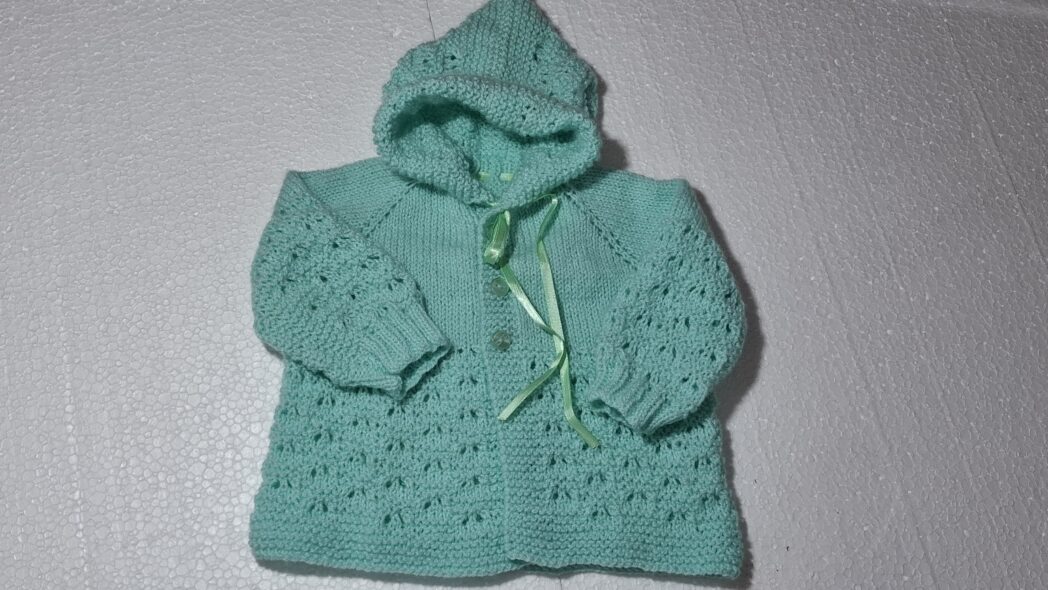 Casaquinho com capuz para bebê de tricô: R$ 150,00+frete.