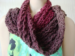 Esse cachecol foi tecido em tricô, com uma lã mesclada na cor beterraba. Ficou lindo!