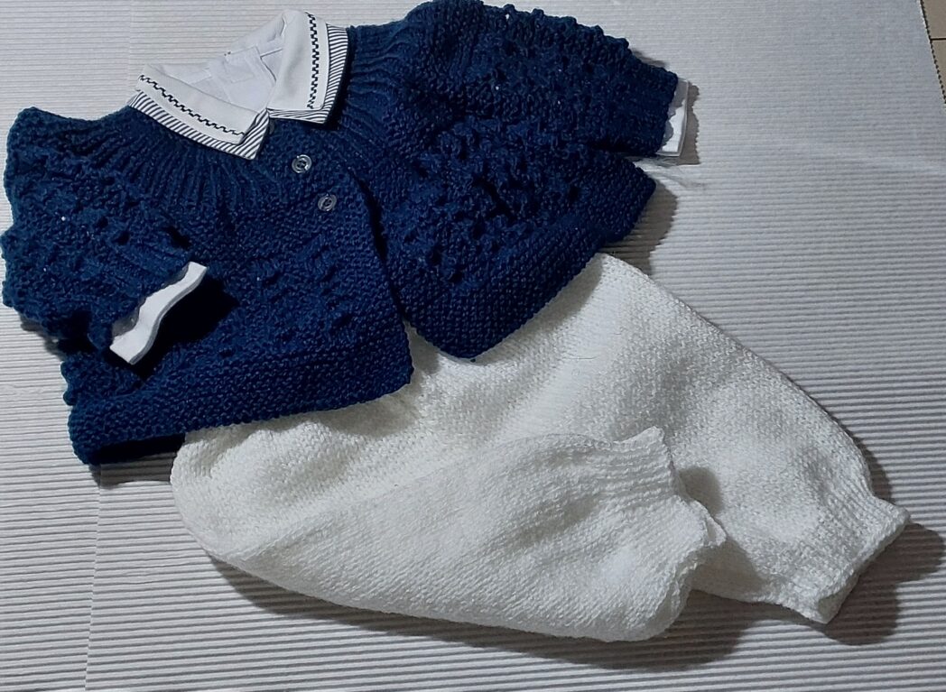 Conjunto Azul e Branco: Calça Comprida e Casaquinho em Tricô