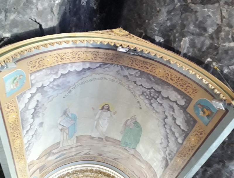 Essa foto refere-se a uma parte da estrutura arquitetônica que protege o presbitério da Gruta, englobando a imagem do Bom Jesus da Lapa na parte principal e das laterais com as imagens de Nossa Senhora e do Sagrado Coração de Jesus e da mesa do Altar principal onde as missas são celebradas diariamente.