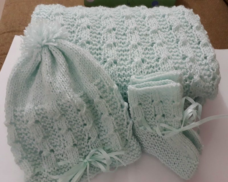 Conjuntinho de tricô para bebê, formado por gorrinho, manta e sapatinho, feita com amor e cuidado, visando proporcionar elegância, conforto e aconchego para o seu bebê.