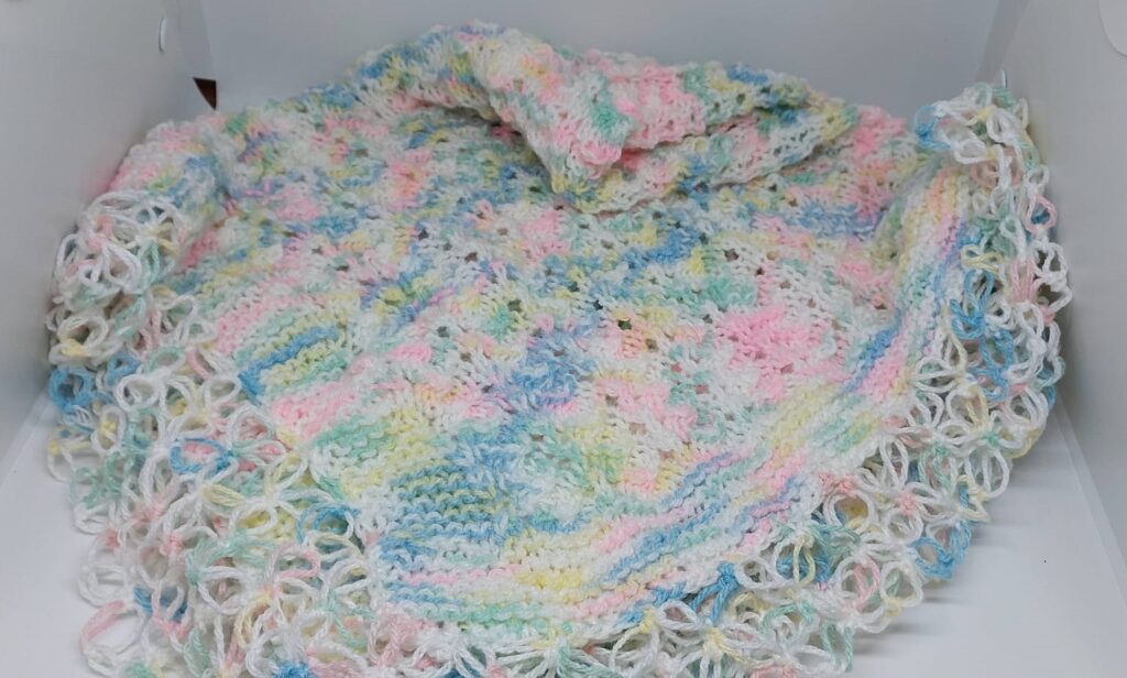 Manta colorida em Tricô para Bebê, Feita à Mão com barrado em crochê, medindo 90x90cm.